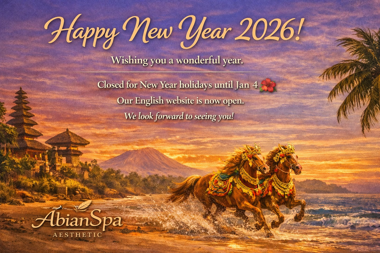 The Abian Spa Aesthetic Japan Office will be closed for New Year holidays until 4 January.